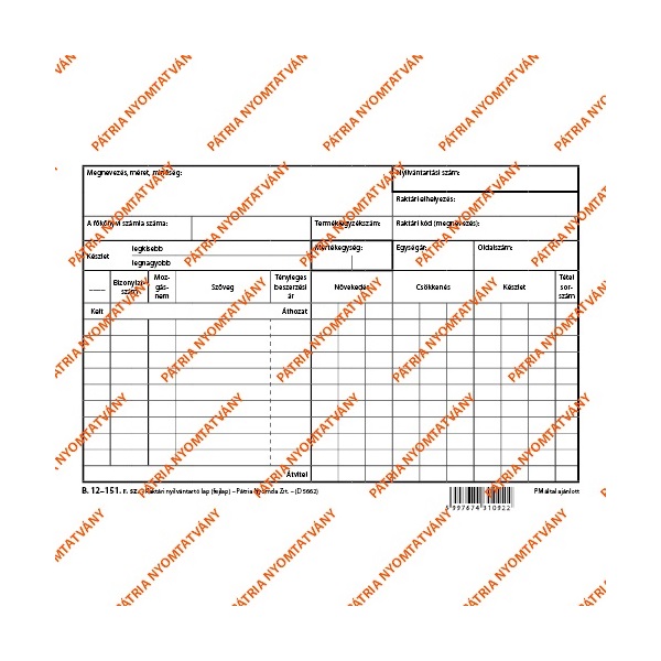B.12-151 A5 "Raktári nyilvántartó lap (fejlap) kicsi" nyomtatvány